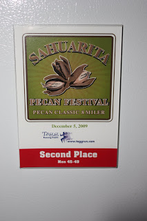 I roll the Toyota out onto Barrazza Aviation Parkway, exit on Kino, pick up I-10 and swoop out onto I-19 south, and in less than 30 minutes, I’m hanging a right off of Sahuarita road into a brightly paved reddish brown parking lot across the street from the Green Valley Pecan Farm. I park, and head over to the registration table to pick up my bib. A blast of cold wind howls around me as I trudge across the crunchy surface, and looking down, I suddenly realize, that I’m actually walking on crushed pecan shells. Nutty!